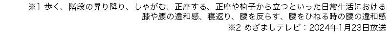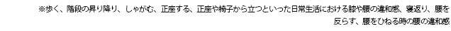 ※歩く、階段の昇り降り、しゃがむ、正座する、正座や椅子から立つといった日常生活における膝や腰の違和感、寝返り、腰を反らす、腰をひねる時の腰の違和感